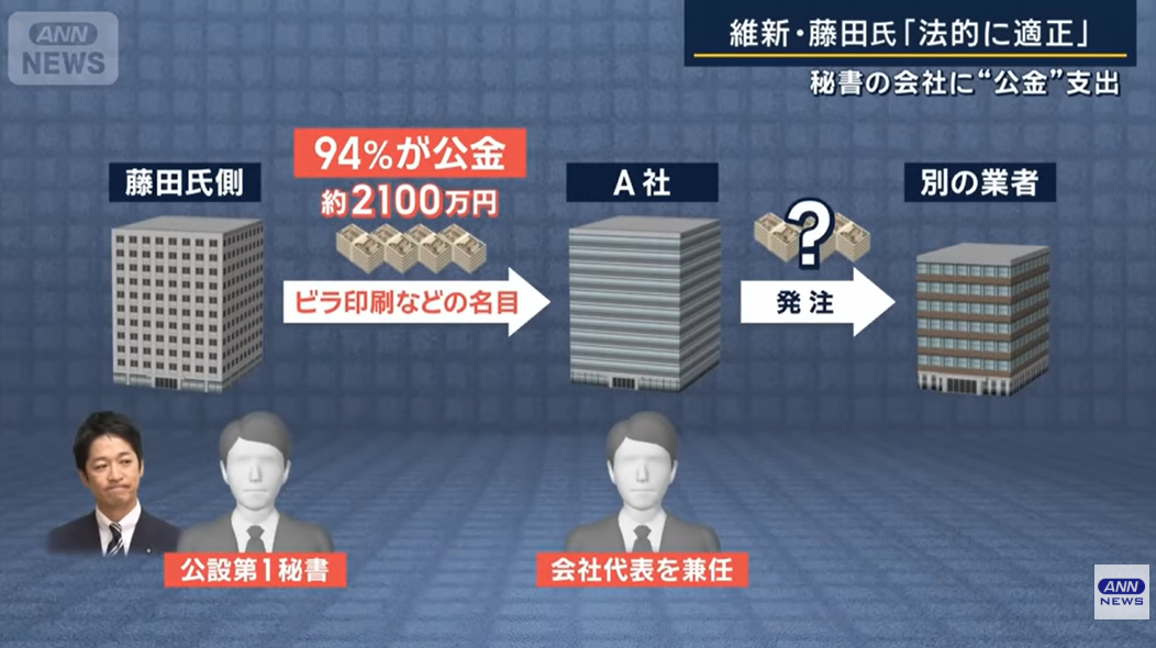 藤田氏は「昨夜のいくつかのテレビ局の編集は偏向報道そのもの。悪意か無知かわかりませんが、一般的な商慣習も基礎知識も無視した恣意的な内容」と問題視した。具体的な放送局、番組については明記していないが、テレビ朝日系「報道ステーション」の動画を添付。動画は藤田氏が「李下に冠を正さず」と話すシーンで始まり、問題を橋下徹氏がSNSで批判していることを紹介。秘書の会社が利益を得ていたかどうかを問う質問に対して「当該企業からの発注先の原価とか、なになにを出してくれと強制的に出した場合、僕ら訴えられますよ。商取引なんで守秘義務もありますから、それはそういう理解だと思ってもらえたらと思います」と語気を強めた場面や、「共同代表としての席は続行されるのか」との問いに「そのつもりですけど」と答えたシーンを伝えた。