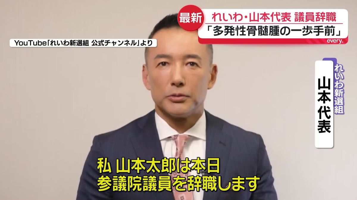 れいわ新選組の山本太郎代表は21日、参院に辞職願を提出し、許可された。これに先立ち、党公式のユーチューブチャンネルに動画を投稿し、健康上の問題を理由に辞職すると明らかにした。山本氏は「多発性骨髄腫、血液のがんの一歩手前にいる。進行させないことを最大のテーマに生きなければ、命を失いかねない。無期限の活動休止に入る」と表明。代表職は続投し、「業務量を大幅に減らして対応する」と説明した。