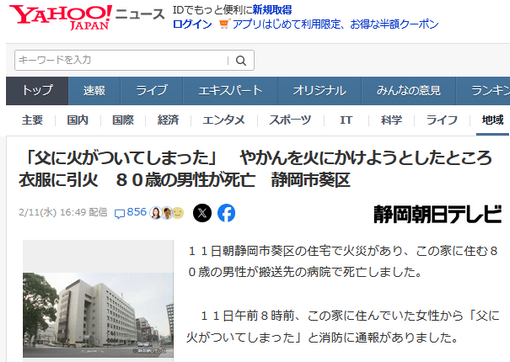 【静岡】「父に火がついてしまった」やかんを火にかけようとしたところ衣服に引火 80歳の男性が死亡