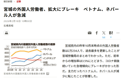 宮城の外国人労働者、拡大にブレーキ ベトナム、ネパール人が急減