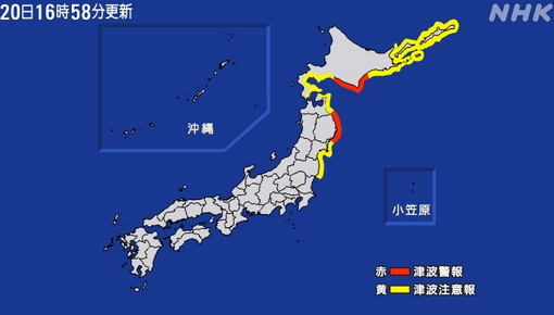 【速報・今すぐ高い場所に逃げて!】津波警報、岩手県 北海道太平洋沿岸中部(16:56)