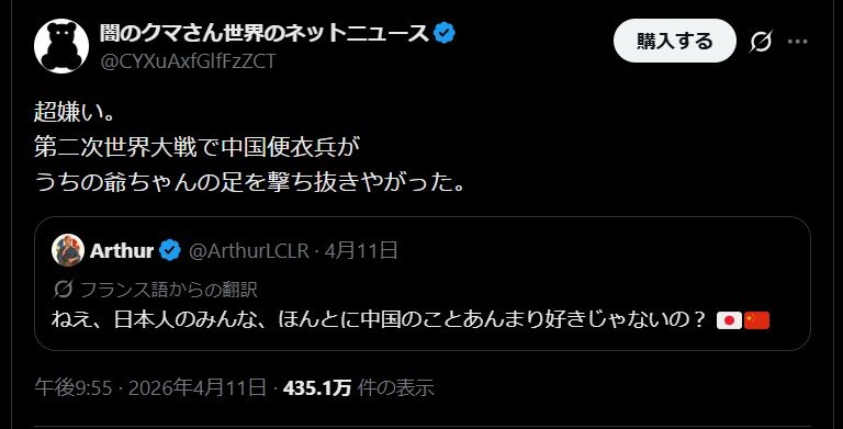 【X自動翻訳】愛国インフルエンサー「俺のじいちゃんが戦争中に中国便衣兵に撃たれて許せない」→ 一瞬で論破される
