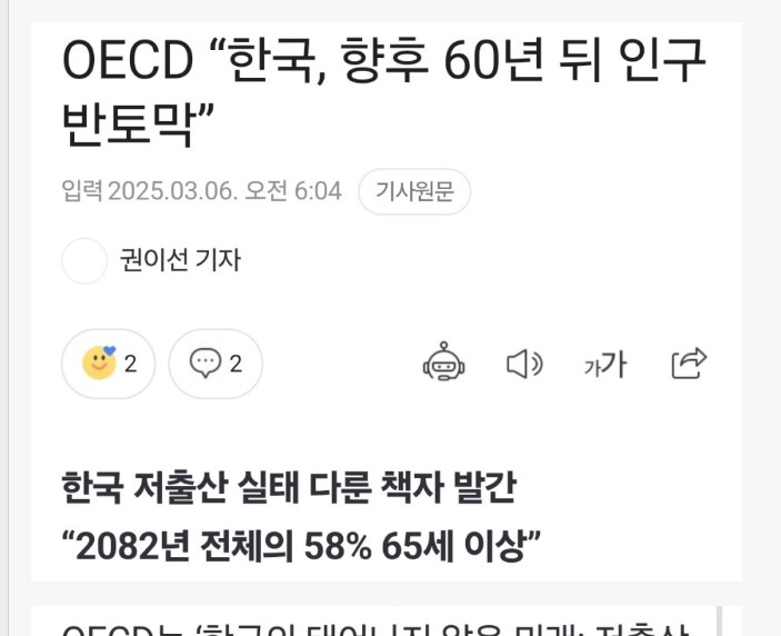 60年後の韓国の人口は今の半分になるそうです。2500万人くらいだとOECDが予想しました。OECDは韓国の少子化の状況を扱った資料を発行した。資料のタイトルは「韓国の未来:少子化傾向と今後の予測」だ。それによると約60年後の2082年には国民の58%が65歳以上となる。出生率の減少は世界的な現象ですが、韓国の場合は2023年基準の合計出生率(女性1人が一生産むと予想される子供の数が0.72人で、世界で最も低い水準だと指摘した。OECDは現在の水準の出生率が改善されない場合、韓国の人口がは約半分にまで減少する。そして、2082年には全人口の約60%が65歳以上となる。老人扶養割合つまり20~64歳人口に対し65歳以上の人口比が現在の28%から155%に急増する。OECDは、韓国の出生率が特に低い理由を指摘している。高い私教育費支出と住宅コストの上昇だ。韓国の親は子供に高いお金を払って塾に通わせる。韓国政府はこの行き過ぎた私教育問題を解決するために努力はしている。既存の学校教育の強化、学習塾の新規参入制、修学能力試験の廃止など様々な努力をしましたがあまり効果はないようです。給料の良い仕事は特定の職種や大企業に集中し労働市場の二極化、それに伴う大学序列化という根本的問題が解決しない限り高い私教育費支出の問題は改善されることはないようです。そしてもう一つ、 2013年から2019年の間に住宅価格が2倍に上昇しました。これにより結婚するカップルが 4-5.7% 減少したと分析されます。