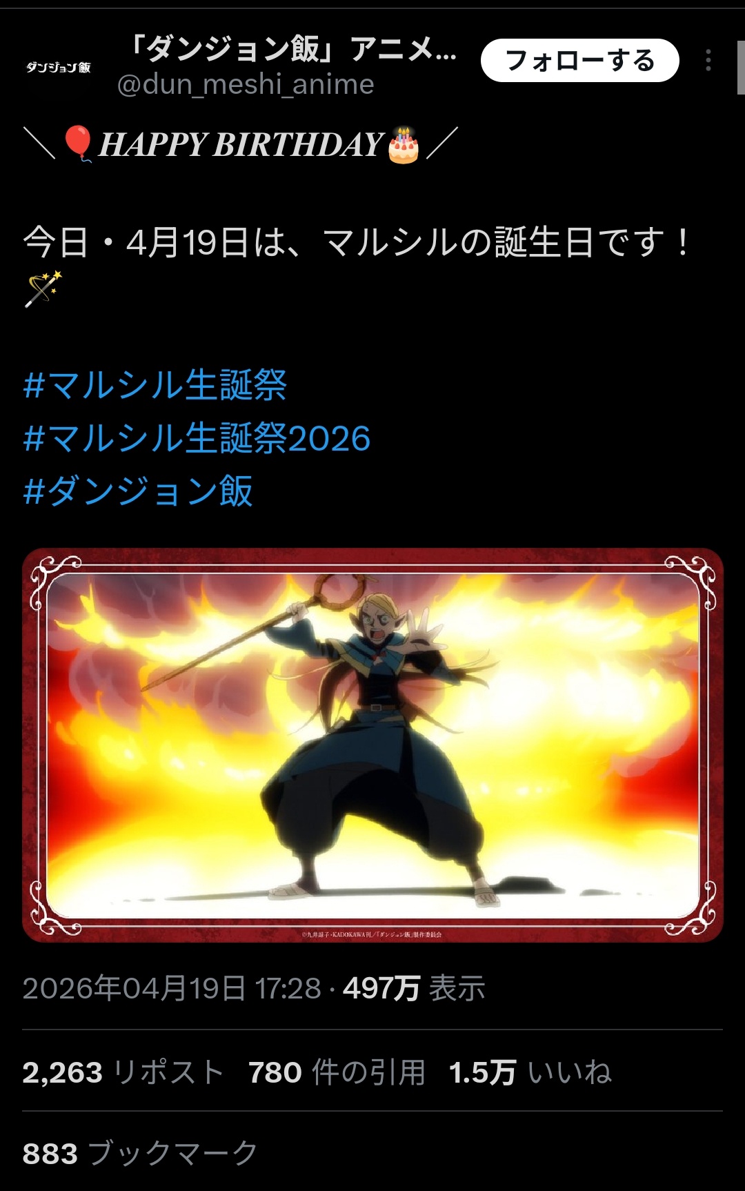 【朗報】ダン飯アニメ公式「今日はマルシルの誕生日です!」←1.5万いいね 2263RT 780引用