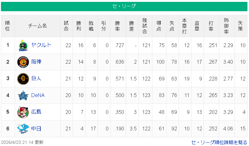 【4/23】ヤ==神=-巨=-/横/===広===-中【順位スレ】