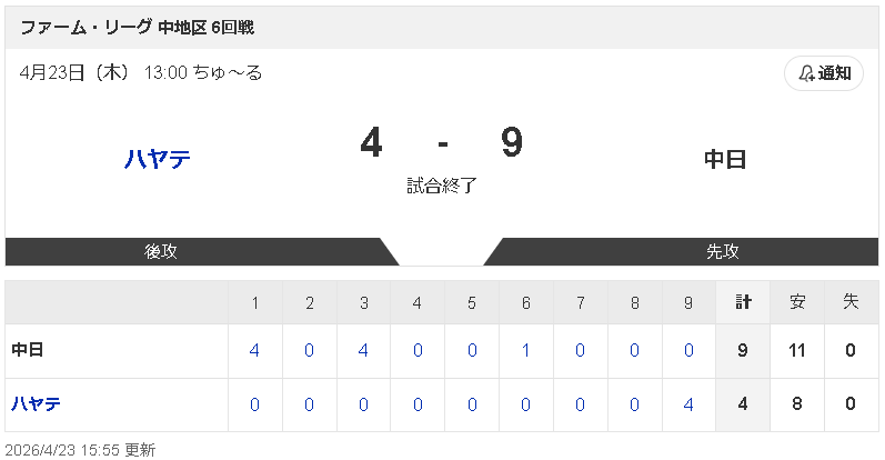 【4/23 2軍 ハ 4-9 D】草加勝が3回無失点、福元悠真2打点などで9得点快勝!7連勝で貯金2!!
