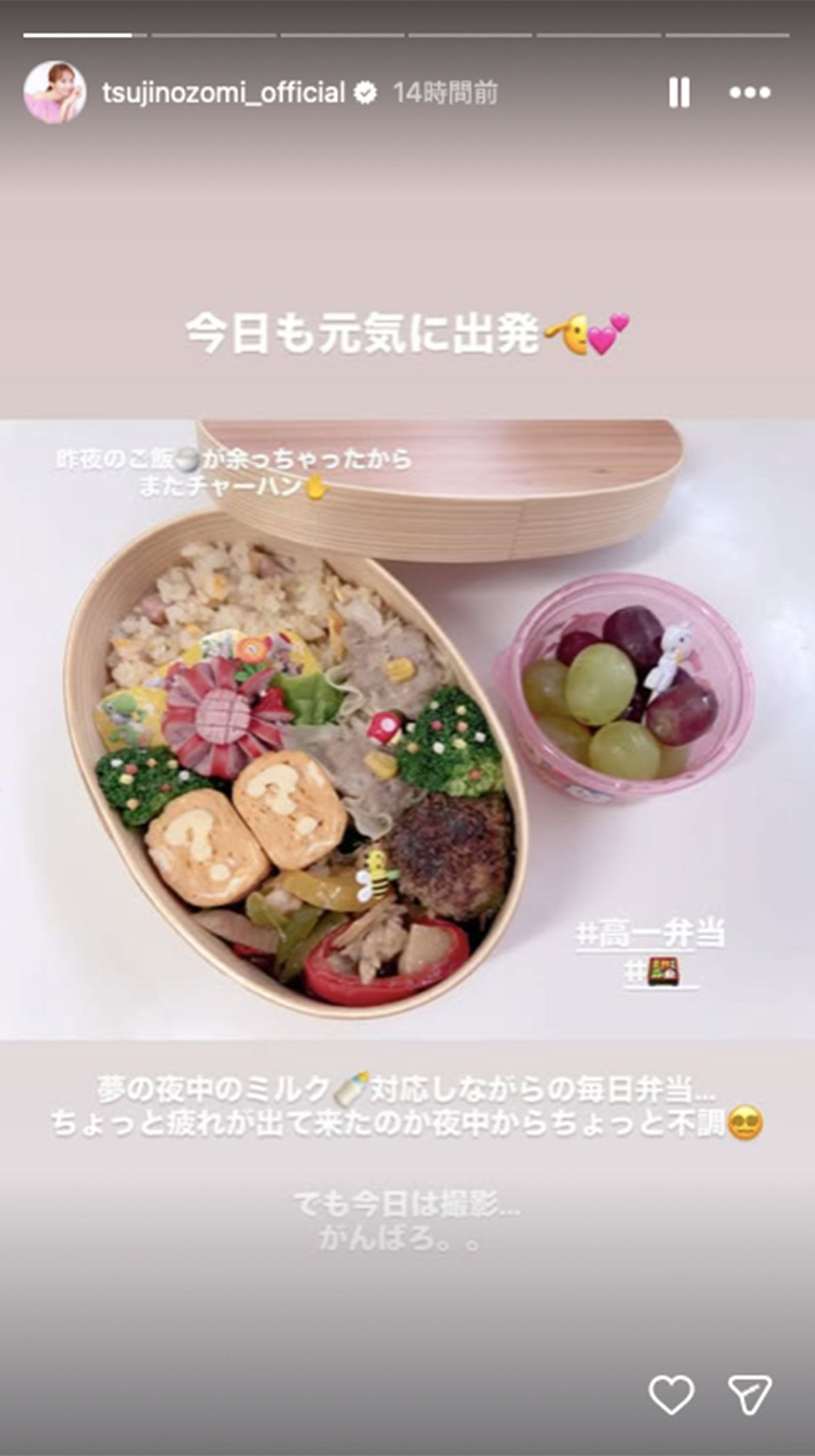 「辻さんは《夢の夜中のミルク対応しながら毎日弁当…ちょっと疲れが出て来たのか夜中からちょっと不調》といったメッセージとともに、お弁当のショットをアップしました。