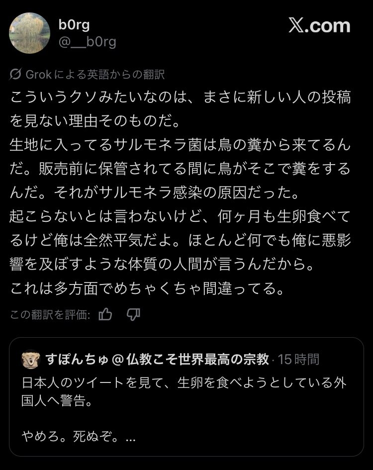 【自動翻訳】X民「生卵を食べれるのは日本だけ!(ホルホル~)」→海外民「何言ってんだこいつ」