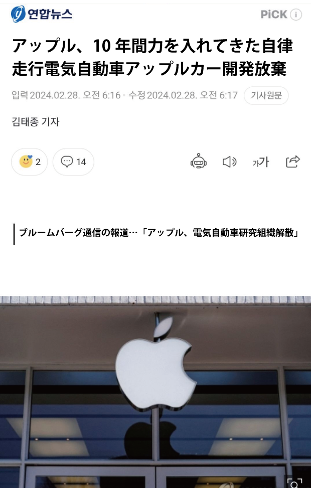 【話題】アップル、10年間の挑戦が終了…自律走行EV「アップルカー」を放棄という記事をご紹介します。