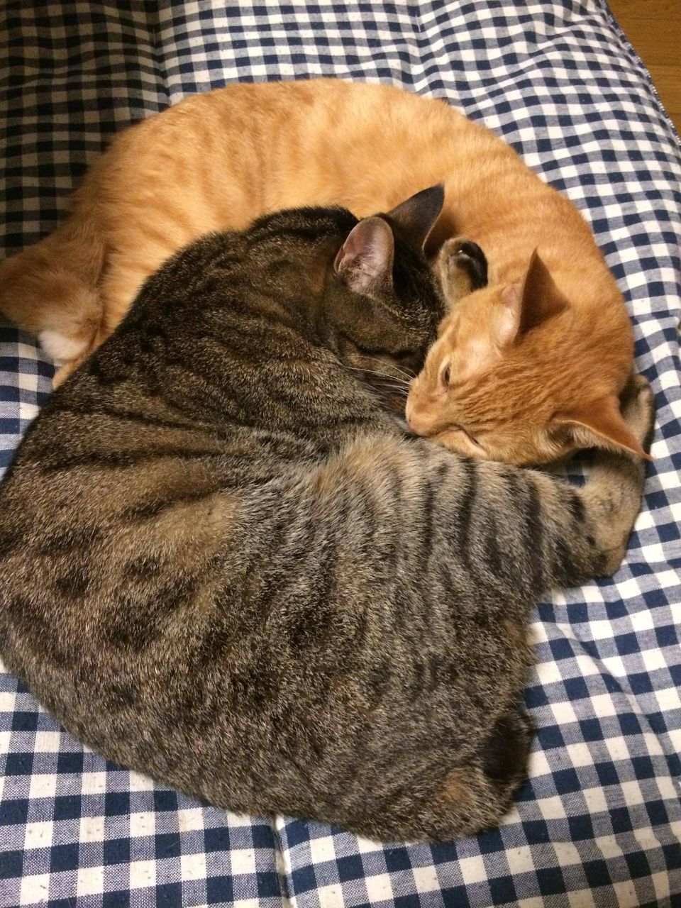 涼しくなってきたからくっついて寝てる → 「○と○のマークみたい」【再】