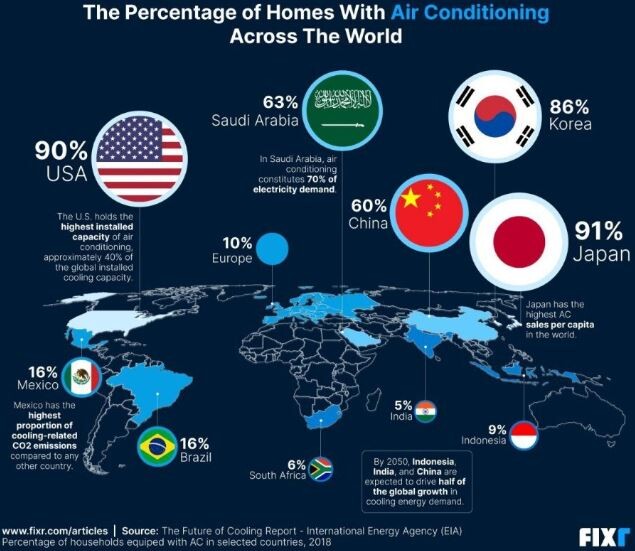 世界の国々のエアコン普及率ランキング
