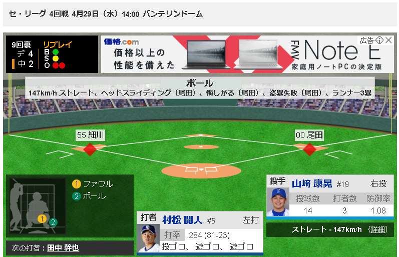 【4/29 D 2-4 DB】先発 櫻井頼之介、2度のリードを守れず…野手陣は9回のチャンス...