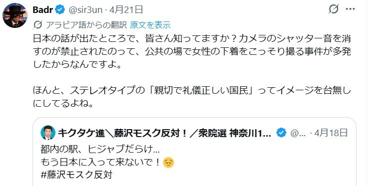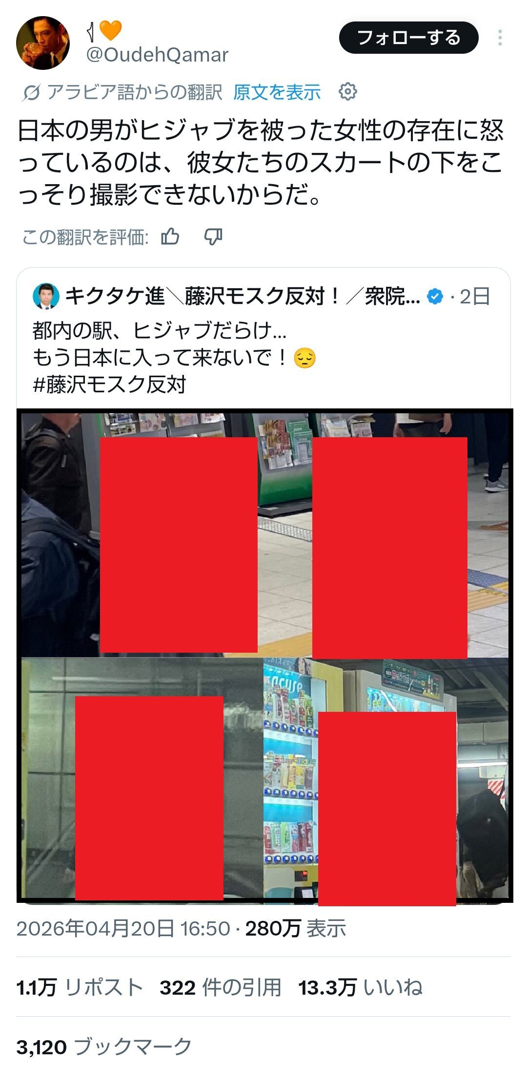 【自動翻訳】愛国者、ヒジャブを被って歩いてるだけの外国人女性を盗撮して晒す→海外から非難の声が殺到
