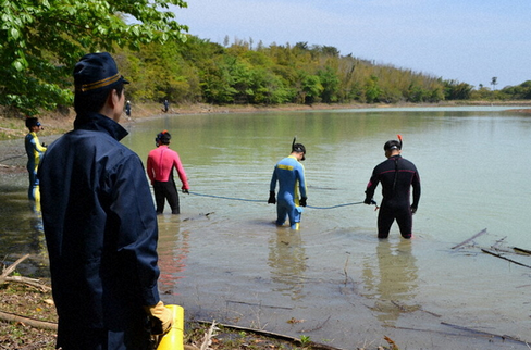 警察犬9頭らと現場付近の山中を調べたほか、最後に目撃された地点に近い「タンベ池」で、県警機動隊潜水部隊20人が水中を捜索。